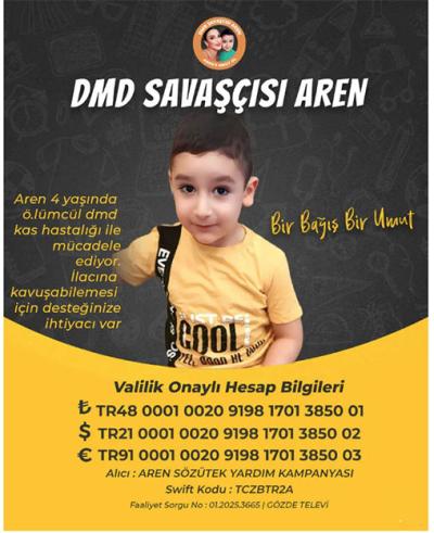 ANNENİN HAYKIRIŞINI DUYUN! Minik Aren’in annesi Gözde, hastalığın Aren’in kaslarını her gün biraz daha yok ettiğine dikkat çekiyor. Ve şu sözleri söylüyor: “Ben bir anne olarak elimden kayıp giden gücünü çaresizce izliyorum. DMD geri dönüşü olmayan bir hastalık. Zaman Aren’in aleyhine işliyor. Bugün yapamadığımız her şey için yarın belki de çok geç olacak. Aren, koşmak, oynamak, büyümek istiyor. Ama bunun için desteğinize ihtiyacımız var. Onun yaşam mücadelesine güç veren tek şey sizin gibi insanların oluşu. Sizlerin yüreklerinin iyi olması. Ne olur Aren’e ses olun. Bu küçük kalbi yalnız bırakmayın. Sizlerden rica ediyorum.” VALİLİK ONAYLI HESAP BİLGİLERİ Türk Lirası – TR48 0001 0020 9198 1701 3850 01 Dolar – TR21 0001 0020 9198 1701 3850 02 Euro – TR91 0001 0020 9198 1701 3850 03 Alıcı : Aren Sözütek Yardım Kampanyası
