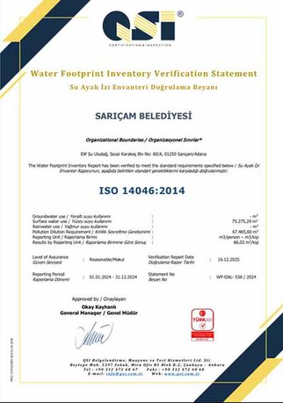 Sarıçam Belediyesi, çevresel sürdürülebilirlik ve iklim değişikliğiyle mücadele alanında dünya çapında bir ilke imza attı. ISO 14046:2014 Su Ayak İzi Standardı kapsamında hazırlanan 2024 yılı, Su Ayak İzi Envanter Raporu ile dünyada bu belgeyi alan ilk yerel yönetim oldu. Bağımsız denetim kuruluşu QSI Belgelendirme tarafından değerlendirilen rapor, 1 Ocak – 31 Aralık 2024 dönemini kapsıyor. “Makul Güven Seviyesi” ile standarda uygun bulunan çalışma kapsamında Sarıçam Belediyesi’nin su kullanımının çevresel etkileri bilimsel verilerle ortaya konuldu. VERİYE DAYALI ÇEVRE YÖNETİMİ Rapor sonuçlarına göre Sarıçam Belediyesi’nin 2024 yılı toplam yüzey suyu kullanımı 75.275,29 m³, su kirliliği nedeniyle seyreltme ihtiyacı 67.485,60 m³, kişi başına düşen yıllık su ayak izi ise 86,03 m³ olarak hesaplandı.