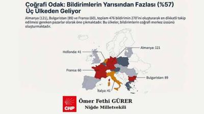 Avrupa kapılarında Türkiye menşeli ürünlere en çok engel koyan ülkelerin başında Almanya ve Bulgaristan geliyor. “8 BİN DENETÇİYLE 1 MİLYON İŞLETME DENETLENEMEZ” CHP Niğde Milletvekili Ömer Fethi Gürer, 2025 yılının pestisit ve gıda zehirlenmelerinin arttığı bir yıl olarak önemli dersler içerdiğini söyledi. Gürer, gıda güvenliği zincirindeki en büyük sorunun “denetim eksikliği” olduğunu vurguladı. Belediye laboratuvarlarının kapatılmasına ve denetim yetkilerinin kısıtlanmasına dikkat çeken Gürer, “Türkiye genelinde 1 milyona yakın gıda işletmesi var ancak Tarım ve Orman Bakanlığı’nın yalnızca 8 bin denetçisi bulunuyor. Yurt içinde de gıda üretiminde alınması gereken önlemler artırılmalıdır.” dedi. GÜRER, DETAYLI LİSTEYİ PAYLAŞTI CHP Niğde Milletvekili Ömer Fethi Gürer, RASFF verilerine göre toplam 476 bildirimin 291’inin sınır reddi, 59’unun uyarı, 93’ünün dikkate yönelik bilgilendirme ve 33’ünün takip amaçlı bilgilendirme olduğunu belirtti. Bildirim yapılan ürün gruplarının başında 295 bildirimle meyve ve sebze gelirken; kuruyemiş, baharat, şekerleme, diyetik gıdalar, kakao ve kakao preparatları, tahıllar ve unlu mamuller, hazır gıdalar ve gıda ile temas eden malzemeler de listede yer aldı. Ülkelere göre dağılımda Almanya 121 bildirimle ilk sırada bulunurken, Bulgaristan 89, Fransa 60, İtalya ve Hollanda 41’er bildirimle sıralandı. Gürer, yurt içi ve yurt dışı denetimlerin üretimin her aşamasında etkin biçimde yapılması ve üretici eğitimlerinin artırılması gerektiğini vurgulayarak, “Avrupa Birliği’nin iade yaklaşımı, alınması gereken önlemler açısından yol göstericidir. Tarımda var olan sorunları azaltmak, Bakanlığın öncelikli görevlerinden biri olmalıdır.” dedi. |