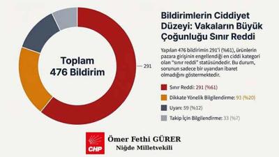 CHP Niğde Milletvekili Ömer Fethi Gürer, 2025 yılına ait Avrupa Birliği Hızlı Alarm Sistemi (RASFF) verilerine göre Türkiye’den gönderilen 476 ürünün “kusurlu” bulunduğunu belirtti. Gürer, bu ürünlerin 291’inin sınır reddi aldığını söyledi. CHP Niğde Milletvekili ve TBMM Tarım, Orman ve Köy İşleri Komisyonu Üyesi Ömer Fethi Gürer, Türkiye’nin gıda ihracatında Avrupa Birliği’ne gönderilen ürünlerde sorunların devam ettiğini ifade etti. Ülkemizden 168 farklı ülkeye ürün gönderildiğini belirten Gürer, yalnızca Avrupa Birliği’nin 2025 yılı RASFF verilerine göre Türkiye menşeli gıda ürünleri için Avrupa kapılarında 476 kez alarm verilmesinin dikkat çekici olduğunu vurguladı. Gürer, 2023-2024 yıllarında Avrupa Birliği Hızlı Alarm Sistemi’ne takılan, farklı ülkelerden gönderilen ürünlerin on binlercesinin pestisit ve aflatoksin gibi istenmeyen zararlı maddeler nedeniyle ret aldığını, iki yılda Türkiye menşeli ürün toplamının ise 853 olduğunu belirterek, 2023 yılında 359, 2024 yılında ise 492 ürünümüzün kusurlu bulunduğunu söyledi. 2025 yılında bu rakamın 476 olduğuna dikkat çeken Gürer, “Bu yıl ihracatta meydana gelen önemli bir düşüş var.