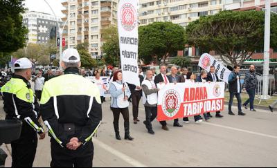 Dr. Hakan Şen, “14 Mart, mesleğimizin onurunu ve halkın sağlık hakkını savunma günüdür” 14 Mart Tıp Bayramı; Adana Tabip Odası Yöneticilerinin Adana Büyükşehir Bandosu eşliğinde Atatürk Anıtı Önüne çelenk bırakıp, saygı duruşunda bulunulup, İstiklal Marşı’nın okunmasıyla başladı. Öğle saatlerinde Kasım Gülek Köprüsü civarında bir araya gelen hekim, sağlık çalışanları Uğur Mumcu (İstasyon) Meydanına kadar yürüdü. Demokratik kitle örgütleri, sendika, dernek ve siyasi parti temsilcilerinin katılarak destek verdiği Beyaz Yürüyüş sonrası Adana Tabip Odası Genel Sekreteri Dr. Hakan Şen, günün anlamına ilişkin basın açıklaması yaptı. 14 MART; TOPLUMDAN YANA BİR ANLAYIŞIN SİMGESİDİR