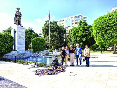 Doruk Gazetesi Sahibi, gazeteci, yazar ve aktivst olan Fatoş Tekbaş iklim yasasına dikkat çekmek için 18 Ekim 2025 Günü Atatürk Parkı, heykelin önünde, kola atık kutularından dünyamızın getirilmek istendiği şekliyle, ünlü Ressam İsmet Çabuk’la birlikte mizansen resim yaptı.