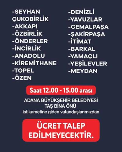 Açıklanan saatler arasında Adana Büyükşehir Belediyesi Taş Bina önü istikametine giden vatandaşlardan ücret talep edilmeyecek. |