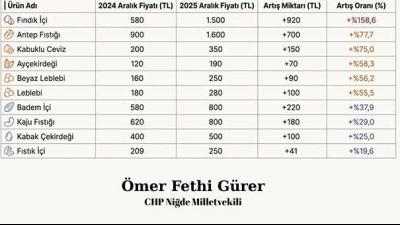 Ömer Fethi Gürer, “Fındık içi yüzde 158 artmış, Antep fıstığı yüzde 78’e dayanmış, leblebi yüzde 55 zamlanmış. Bunlar yılbaşı sofrasında vatandaşın elini titreten fiyatlar” dedi.