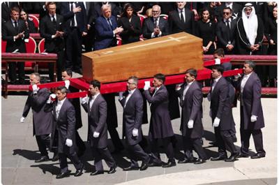 Yaklaşık 400.000 kişi, Vatikan Şehri'ndeki Papa Francis'in cenaze töreni için Roma sokaklarını doldurdu ve Aziz Petrus Meydanı'nda toplandı, yas günlerinin doruk noktasını işaret etti. Katılımcılar arasında dünya liderleri ve dünyanın dört bir yanından ileri gelenler vardı.