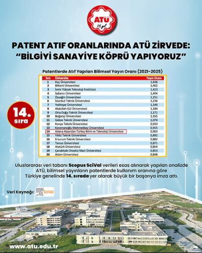 Adana Alparslan Türkeş Bilim ve Teknoloji Üniversitesi (ATÜ), bilimsel araştırma çıktılarının teknolojiye ve sanayiye aktarılma başarısını tescilledi. Uluslararası veri tabanı Scopus SciVal verileri esas alınarak yapılan analizde ATÜ, bilimsel yayınların patentlerde kullanım oranına göre Türkiye genelinde 14. sırada yer alarak büyük bir başarıya imza attı. 2021–2025 dönemini kapsayan ve üniversitelerin ürettiği akademik makalelerin patent başvurularında ne ölçüde referans alındığını inceleyen araştırmada, ATÜ’nün patent atıf oranı dikkat çekti. Bu başarı, üniversite bünyesinde yürütülen bilimsel çalışmaların sadece teorik düzeyde kalmadığını; aynı zamanda yenilikçi teknolojilere, sanayi uygulamalarına ve Ar-Ge süreçlerine doğrudan kaynaklık ettiğini somut bir şekilde ortaya koydu. Elde edilen başarıyla ilgili değerlendirmelerde bulunan Üniversite Rektörü Prof. Dr. Adnan Sözen, ATÜ’nün temel vizyonunun bilgiyi üretime dönüştürmek olduğunu vurguladı. Rektör Sözen, "Üniversitemizin Türkiye genelinde 14. sırada yer alması, tesadüfi bir başarı değil, sistematik bir akademik vizyonun sonucudur.