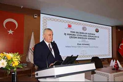 YENİ GELİŞMELER IŞIĞINDA İŞ HUKUKU UYGULAMA SORUNLARI VE ÇÖZÜM ÖNERİLERİ SEMİNERİNİ ADANA’DA GERÇEKLEŞTİRİLDİ. ADANA’DAKİ SEMİNERDE İŞ HUKUKUNDAKİ SORUNLARA ÇÖZÜM ARAYIŞI İş dünyasının iş hukuku alanında karşılaştığı güncel sorunları ve bu sorunlara yönelik yargıtay içtihatları ışığında geliştirilen çözüm önerilerini tartışmak amacıyla Adana Sanayi Odası (ADASO), İş Hukuku ve Sosyal Güvenlik Hukuku Derneği (Türk Milli Komitesi) ve Adana Barosu iş birliğinde "Yeni Gelişmeler Işığında İş Hukuku Uygulama Sorunları ve Çözüm Önerileri Semineri" gerçekleştirildi. Adana Ticaret Odası Konferans Salonu’ndaki seminerin açılışında konuşan 29. Dönem TBMM Başkanı, 58. Ve 59. Dönem Adalet Bakanı, TOBBUYUM Uyuşmazlık Çözüm Merkezi Yönetim Kurulu Başkanı Cemil Çiçek, hukuki istikrar olmadan hiçbir girişimin başarıya ulaşamayacağını belirterek, “Türkiye’de 9 bin 300’den fazla yürürlükte yasa var. Meclis, bir kanun fabrikası gibi çalışıyor ama sorunlarımız bitmiyor. Demek ki kanun çıkarmak tek başına yeterli değil.” dedi.