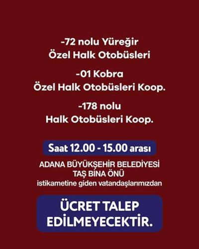 Açıklanan saatler arasında Adana Büyükşehir Belediyesi Taş Bina önü istikametine giden vatandaşlardan ücret talep edilmeyecek. |