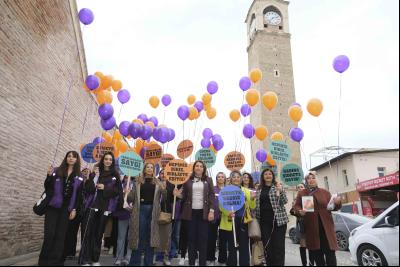 Her bir fidan, hayatı elinden alınan kadınların anısına bir umut, geleceğe bırakılan bir iz oldu. Kök salan her yeni yaşam, şiddetsiz bir dünya için verilen mücadelenin simgesi olarak büyümeye devam edecek. MOR VE TURUNCU BALONLAR GÖKYÜZÜNE BIRAKILDI Ayrıca Adana’nın simgesi olan Tarihi Büyük Saat önünde, “Kadına Yönelik Şiddete Karşı Ses Çıkarıyoruz” sloganıyla anlamlı bir etkinlik gerçekleştirildi. Kadınlar, şiddetsiz bir dünya dileğiyle mor ve turuncu balonlarını gökyüzüne bıraktı. Göğe yükselen her balon, şiddetin son bulması yönündeki kararlılığı, dayanışmayı ve umudu simgeledi.