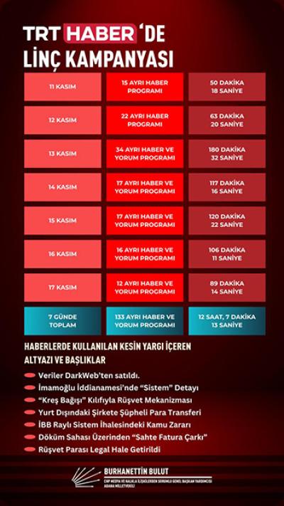 İBB’ye yönelik 19 Mart siyasi operasyonunun hemen ardından, kamu yayıncısı olan TRT Haber’de tarafsızlık ilkesi açıkça yok sayılmış, soruşturmanın gizliliği alenen ihlal edilmiş, daha yargı süreci başlamadan insanlar suçlu ilan edilmiştir. Darbenin medya kolu olarak hareket eden TRT’nin öncülüğünde yandaş medya kanalları organize bir linç kampanyası yürütmekte, RTÜK ise yapılan şikayetleri sümen altı ederek bu hukuk ve etik katliamının ortağı haline gelmektedir. TRT yöneticileri Beştepe’ye sırtını dayayıp Oran Sitesi’nden, Söğütözü’ne, demokrasiye, adalete, hukuka ateş ediyorlar. İddianame açıklandıktan sonraki 11-17 Kasım tarihleri arasında toplam 12 saat 7 dakika 13 saniye, tek yanlı ve masumiyet karinesini yok sayan tek yanlı kara propoganda yapıldı. Karalama kampanyasının üssü TRT Haber’de Birinci Sayfa ve Odak Gündem programları başta olmak üzere 133 haber ve yorum programında kişileri peşinen suçlu ilan eden ifadelere ve alt yazılara yer verildi. Ekranlara çıkarılan sözde yorumcular, masumiyet karinesini ayaklar altına alarak seçilmiş belediye başkanlarımızı peşinen suçlu ilan etmekte, çete ve mafya gibi ağır ithamlarla hedef göstermekte; şahsiyetlerine, ailelerine, onurlarına pervasızca saldırmaktadır. Bu, sadece kişi haklarına değil, demokrasiye, hukukun üstünlüğüne ve halk iradesine dönük bir operasyondur. Oysa 2954 sayılı TRT Kanunu’nun 5’inci maddesi çok nettir: (k) bendi: Haberlerin toplanması, seçilmesi ve yayınlanmasında tarafsızlık, doğruluk, çabukluk ve çağdaş habercilik ilkelerine bağlı kalmak. (m) bendi: Kamuoyunun sağlıklı ve serbestçe oluşabilmesi için yeterli yayın yapmak; tek yönlü ve taraflı yayın yapmamak; hiçbir parti, grup, çıkar çevresi, inanç veya düşüncenin menfaatlerine alet olmamak. (j) bendi: Kişilerin özel hayatına, şeref ve haysiyetine saygılı olmak ve dürüstlük anlayışından ayrılmamak. Aynı şekilde 6112 sayılı RTÜK Kanunu’nun “Yayın hizmeti ilkeleri” başlıklı 8’inci maddesinin (i) bendi de açık hüküm içermektedir: “Suçlu olduğu yargı kararıyla kesinleşmedikçe hiç kimse suçlu ilan edilemez veya suçluymuş gibi gösterilemez; yargıya intikal eden konularda yargılama sürecini ve tarafsızlığını etkiler nitelikte yayın yapılamaz.” “TRT, ÇİRKİN KAMPANYALARININ MERKEZİ OLAMAZ” TRT, iktidarın emir eri RTÜK de talimatla çalışan bir sansür kurumu değildir. Bu millet kendi vergileriyle finanse ettiği kurumları bir grubun siyasal sopası olsun diye değil, adil, tarafsız ve bağımsız yayıncılık yapılsın diye kurmuştur. TRT yöneticilerine sesleniyorum: Göreviniz, bir siyasi partinin çıkarlarını korumak değil; kamu yararına hizmet etmektir. TRT ekranları; çirkin linç kampanyalarının, hedef göstermenin, sopa gibi kullanılan siyasi söylemlerin merkezi olamaz. Kamu gücünün böyle kötüye kullanılması demokrasiye ve milli iradeye ihanettir. TRT ve yönetimi bir an önce kendilerine çeki düzen vermelidir.” TRT HABER’DE LİNÇ KAMPANYASI TRT Haber’de iddianamenin açıklandığı günden başlayarak bir haftalık tarama...