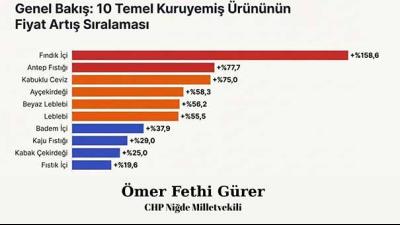 Ömer Fethi Gürer, “Fındık içi yüzde 158 artmış, Antep fıstığı yüzde 78’e dayanmış, leblebi yüzde 55 zamlanmış. Bunlar yılbaşı sofrasında vatandaşın elini titreten fiyatlar” dedi.