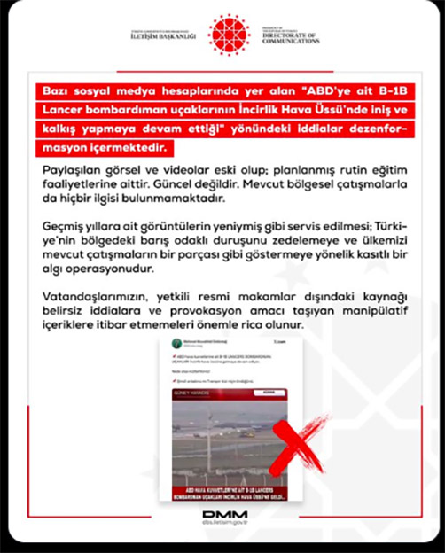 İncirlik Hava Üssü üzerinden yayılan “ABD bombardıman uçakları hareketliliği” iddialarına resmi kaynaklardan açıklama geldi. Görüntülerin eski olduğu ve dezenformasyon içerdiği belirtildi. Bazı sosyal medya hesaplarında yer alan "ABD’ye ait B-1B Lancer bombardıman uçaklarının İncirlik Hava Üssü’nde iniş ve kalkış yapmaya devam ettiği" yönündeki iddialar dezenformasyon içermektedir. Paylaşılan görsel ve videolar eski olup; planlanmış rutin eğitim faaliyetlerine aittir. Güncel değildir. Mevcut bölgesel çatışmalarla da hiçbir ilgisi bulunmamaktadır. Geçmiş yıllara ait görüntülerin yeniymiş gibi servis edilmesi; Türkiye’nin bölgedeki barış odaklı duruşunu zedelemeye ve ülkemizi mevcut çatışmaların bir parçası gibi göstermeye yönelik kasıtlı bir algı operasyonudur. Vatandaşlarımızın, yetkili resmi makamlar dışındaki kaynağı belirsiz iddialara ve provokasyon amacı taşıyan manipülatif içeriklere itibar etmemeleri önemle rica olunur. |