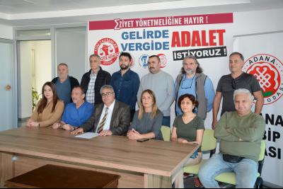 VERGİDE ADALET İSTİYORUZ! Adana Tabip Odası, SES ve Genel Sağlık İş yönetici ve üyeleri Vergide-Gelirde Adalet Adana Tabip Odasında bir araya gelen sağlık bileşenleri adına basın açıklamasını okuyan Adana Tabip Odası Başkanı Uzm. Dr. Özden Polatöz, “Daha önce Türk Tabipleri Birliği Aile Hekimliği Kolu (TTB AHEK) ile Sağlık ve Sosyal Hizmet Emekçileri Sendikası (SES) tarafından 21 Şubat 2024’te başlatılan ve her hafta çarşamba günleri sürdürülen eylemlerimiz, 12 Mart 2025’e kadar aralıksız devam etmiştir. Aile sağlığı merkezi (ASM) çalışanlarından yapılan ve %35’e varan adaletsiz vergi kesintilerinin en fazla %15 ile sınırlandırılması ve yıl içinde sabit tutulması talebimizin karşılanmaması nedeniyle, eylemlerimizi ücretlerimizi kesintili aldığımız her ayın 15’ini takip eden çarşamba günleri sürdüreceğiz. “Vergide Adalet” eylemlerimize hükümet tarafından hiçbir yanıt verilmediği gibi; ücretlerimiz enflasyon karşısında giderek erimekte, satın alım gücümüz düşmekte ve tüm ücretlilerde olduğu gibi maaşlarımızdan yüksek oranda, peşin vergi kesintileri yapılmaktadır. Bugün 19 Kasım 2025 Çarşamba. “Aile hekimliği çalışanları vergide adalet istiyor!” eylemlerinin ikinci safhasında ve 52. haftasında yine ASM önlerindeyiz. Sağlık çalışanları, ücretlerindeki erime ve yüksek vergi kesintileri nedeniyle giderek yoksullaşırken; toplumun yoksul ve emekçi kesimlerinin de zor ekonomik koşullarda yeterli ve dengeli beslenemediğine tanıklık etmekte, bu durumun daha da derinleşeceğinden endişe duymaktadır.”